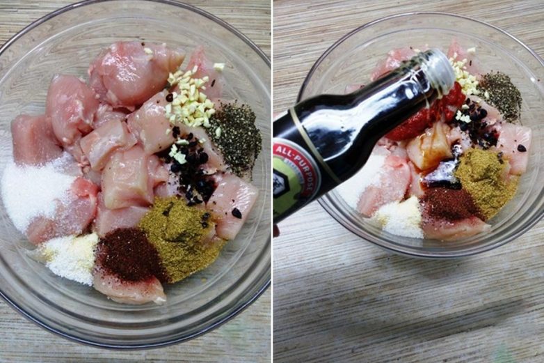 Добавляй в филе специи, которые подготовил, плюс сахар и соль. Барбарис и чеснок лучше всего измельчить ножом на маленькие кусочки.Теперь добавь соевый соус и томатную пасту, надевай перчатку (а можно и без нее) и несколько минут перемешивай-втирай специи в мясо.