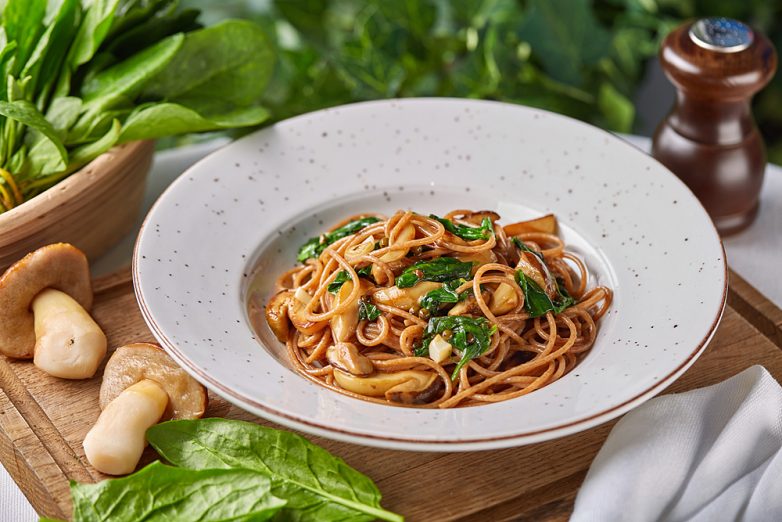Шаг 1. Белые грибы нарезать, обжарить на оливковом масле с добавлением чеснока, перца горошком, базилика и шпината. В готовую смесь добавить рукколу.