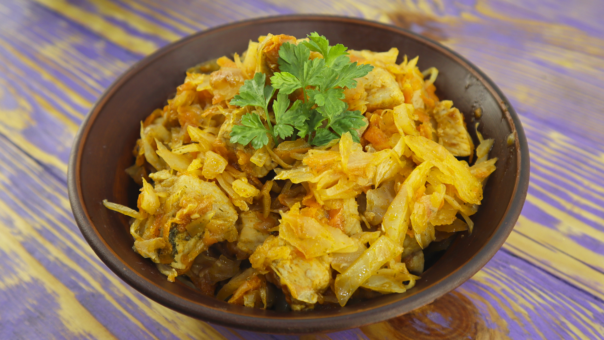 Быстрый, вкусный и легкий рецепт тушеной капусты со свининой!