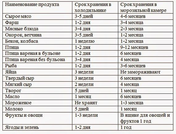Сроки хранения продуктов в холодильнике тоже разные, можно узнать о них из следующей таблицы.