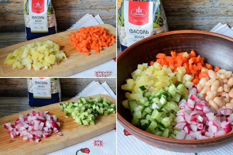 Точно так же отвари картофели и морковь, дай остыть и нарежь кубиками. Так же поступи с огурцом и редисом, смешай всё и теперь добавь остывшую фасоль.