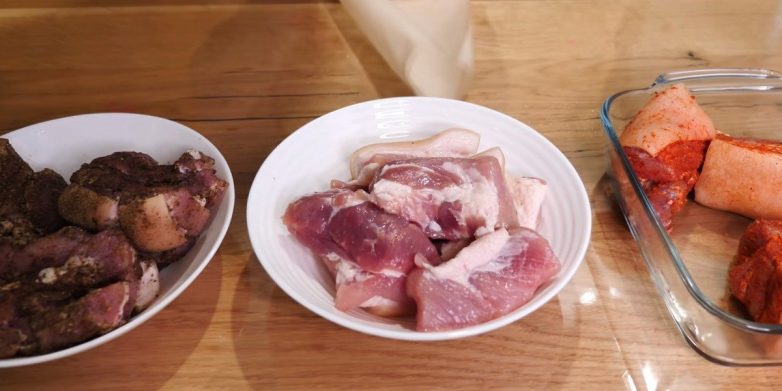 Теперь подготовь сало, избавившись от костей и мяса. Затем промой сало под проточной водой, обсуши бумажными полотенцами и нарежь крупными кусками. Также почисти чеснок и нарежь его тонкими пластинками.