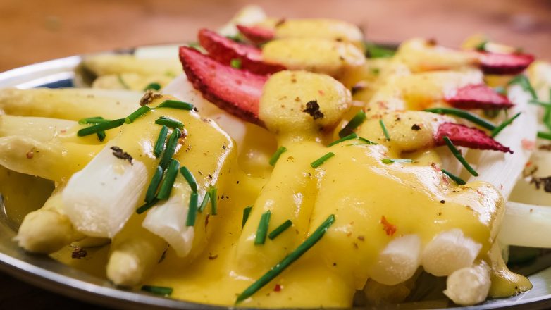 Спаржа и голландский соус, или голландез. Это блюдо особенно популярно у нас, в Германии. И это сезонное блюдо, поэтому особенно популярна спаржа весной. Мы приготовим классический рецепт спаржи с соусом голландез.