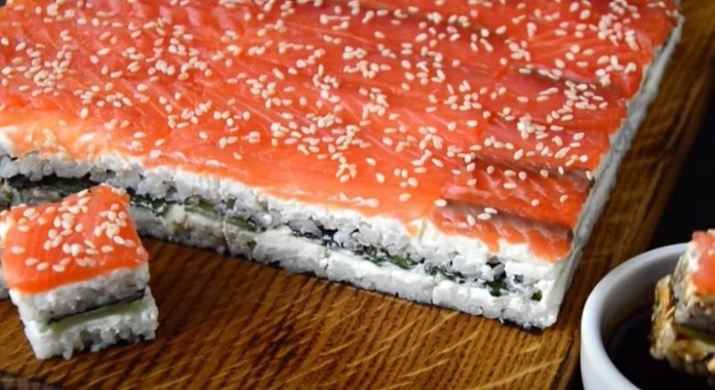 Вот и всё, аппетитный торт-суши готов. Приятного аппетита!