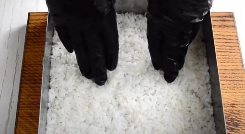 Поставь форму на красивое сервировочное блюдо. На дно формы выкладывай лист нори, далее нужно равномерно распределить половину риса. Уплотняй рис по поверхности формы плотно. Удобнее всего это делать мокрыми руками.