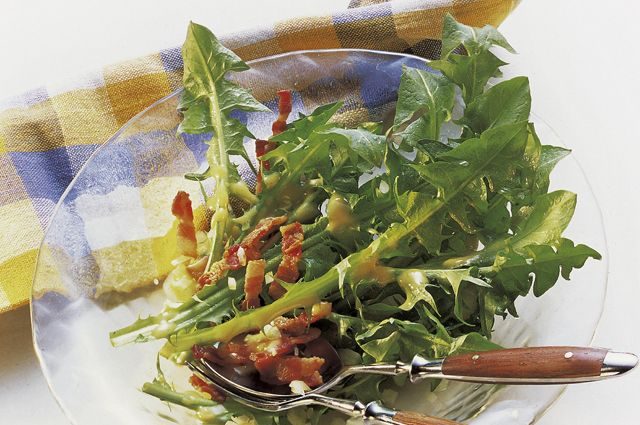 Для салата подойдут молодые листья одуванчика, а также желтые цветки.Горсть листьев одуванчика