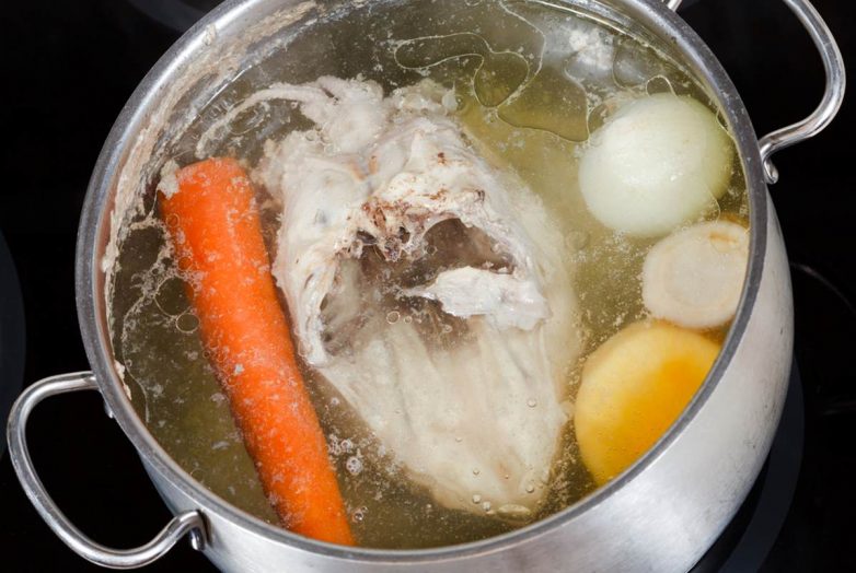 Чтобы бульон получился полезным и вкусным, его обязательно надо варить из домашней птицы. Покупное мясо на это не годится. Один бог знает, чем пичкают бройлеров на птицефабриках. А потому надо обязательно сливать первый бульон. Во-первых, так ты избавишься от всех нехороших бактерий, что были в мясе, и не забывай, что кожица — это самая вредная часть в курице, лучше готовить блюда из куриного мяса без шкурки. Во-вторых, если не слить первый бульон, он будет мутным. Поэтому надо довести первый бульон до кипения и сразу слить воду, а затем набрать чистой воды и варить куриный бульон как полагается.