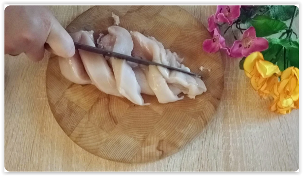Куриное филе нарезаю произвольными кусочками.