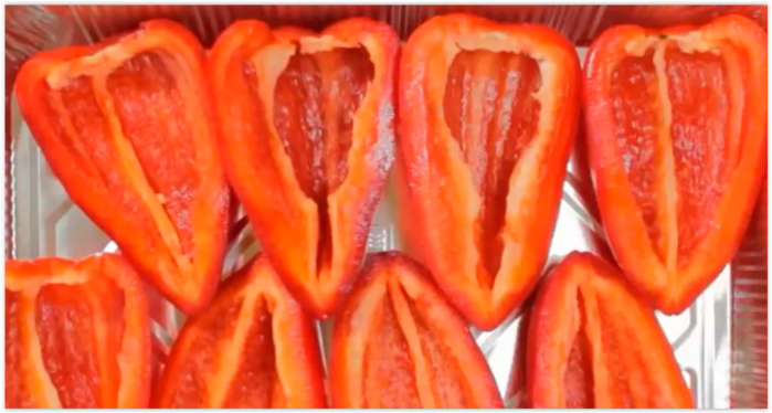 2. Параллельно этому чистим наши 4 перчика, разрезаем их на половинки и укладываем в форму для выпекания.