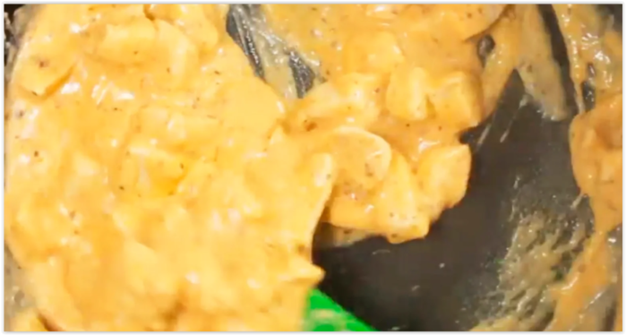 3. В нашу курочку добавляем соль, специи. Затем добавляем прямо в сковороду муку 1 столовую ложку, перемешиваем. Следом идет сметана 2 столовые ложки, немного тушим. В конце добавляем 70 миллилитров воды. В итоге, у вас должно получиться мясо в нежном соусе, как на фото. Важно! Чаще перемешивайте мясо и не давайте ему обжариваться. Оно должно сохранить свою нежность!