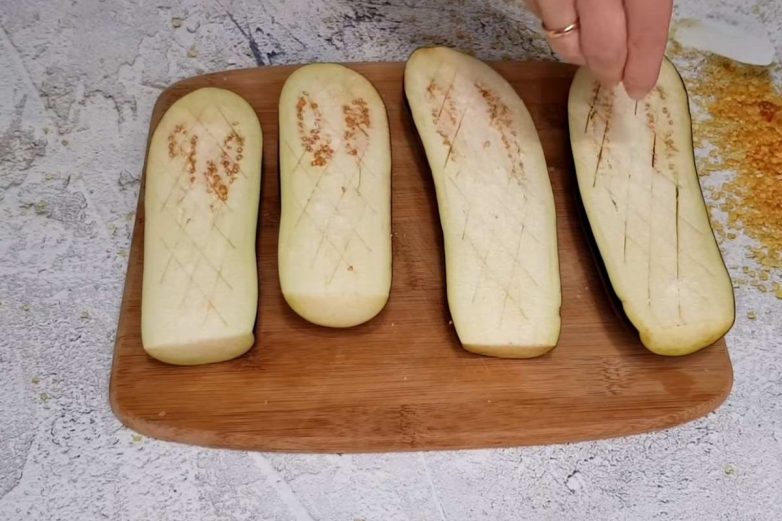 Нарежь промытые баклажаны пластинами около 7 мм толщиной. Сделай на них ножом сеточку. Посоли и оставь на 10 минут, чтобы избавиться от излишней горечи.