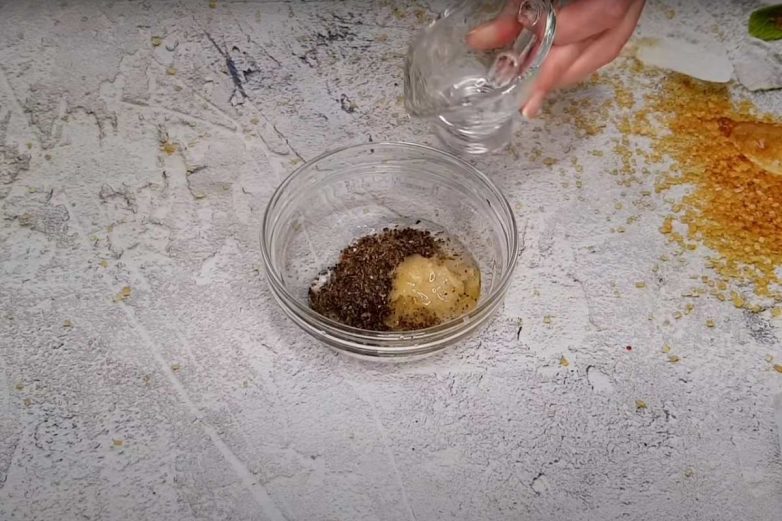 Приготовь заправку. Для этого смешай выдавленный через пресс чеснок, соль, черный перец, сушеный базилик, 2 столовые ложки растительного масла.