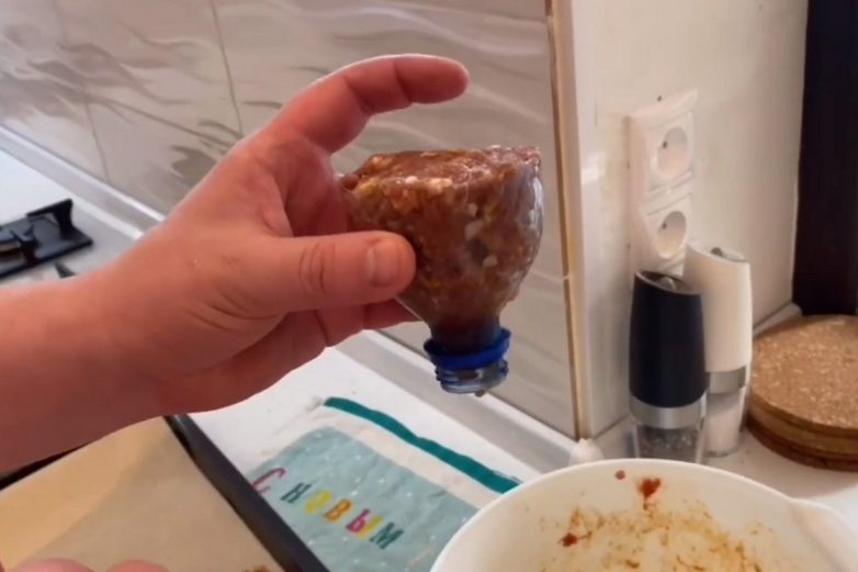 Пропусти фарш через отрезанный верх пластиковой бутылки. Должны получиться плотные колбаски одинакового размера, как на фото.