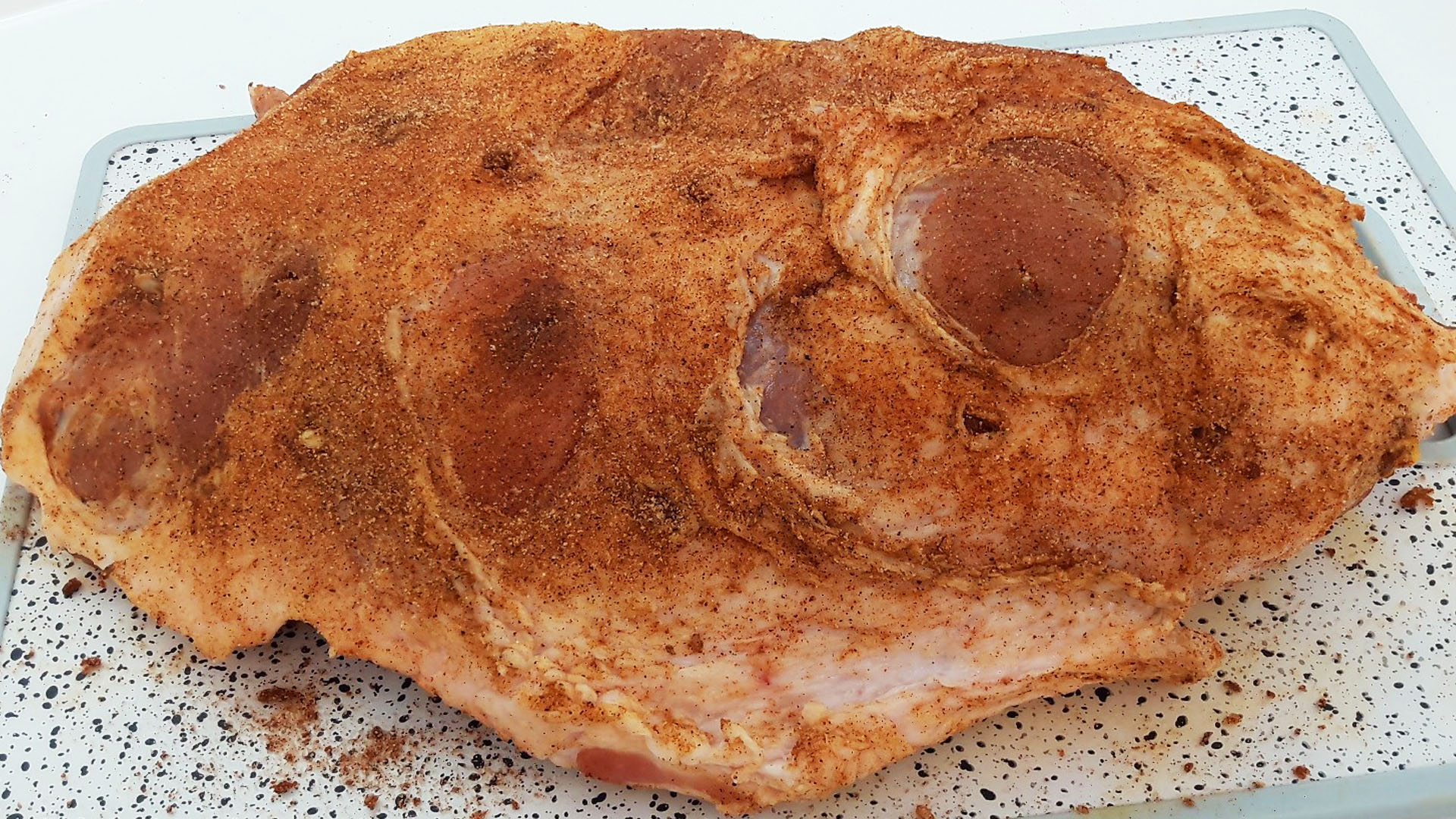 Остатками специй натираем поверхность всего мяса, тщательно втирая.