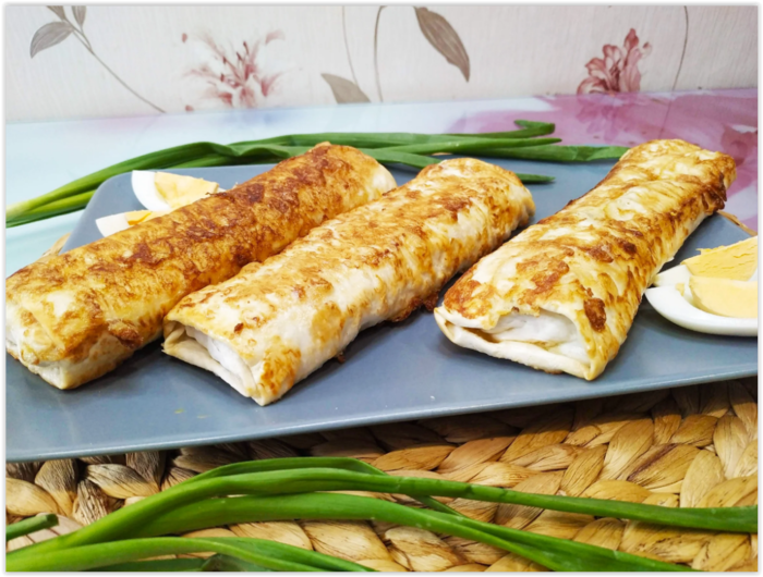 Нарезаем весь лаваш в размер заготовки, кладём начинку и сворачиваем в рулет (как шаурму). В сковороду наливаем немного растительного масла и разогреваем.