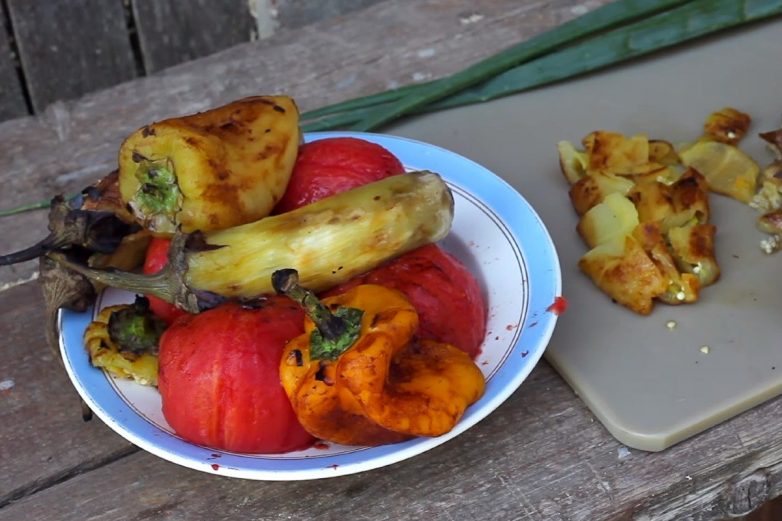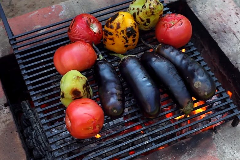 Берем баклажаны, томаты, перец и целиком выкладываем на решетку-гриль для мангала. Жарим 15–20 минут. В процессе овощи переворачиваем. Если используем духовку, то поступаем так: противень застилаем пергаментом для выпечки, сверху кладем решетку и выкладываем на нее овощи. Запекаем при температуре 250 °C около 30–40 минут (зависит от духовки).