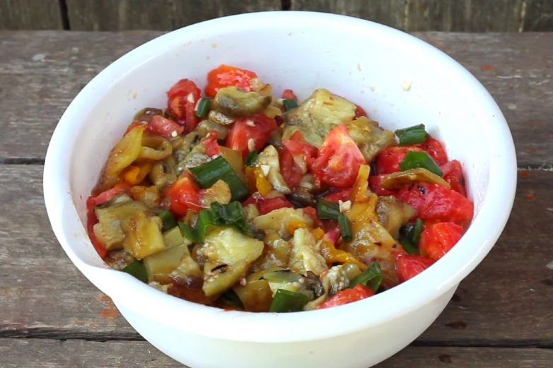 Снимаем овощи с огня или достаем из духовки. На этом этапе, если есть время, можно поместить овощи в пакет, чтобы они «дошли». Но это необязательно. Затем очищаем овощи от кожуры с помощью холодной воды. Нарезаем баклажаны, томаты и перец кусочками среднего размера.