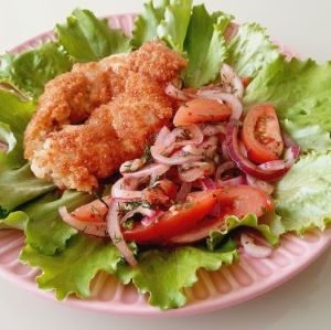 Тоже самое проделать и с другой стороной. Выложить на красивое блюдо салатные листья сверху отбивную, а рядом закуску из помидорок.