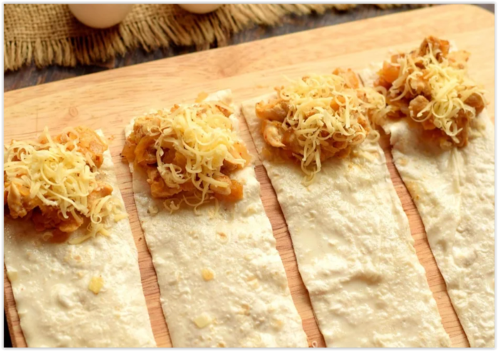 Полоски лаваша с одной стороны смажьте соусом, чтобы лаваш стал мягче. На край каждой полоски уложите небольшое количество жареной курицы.
