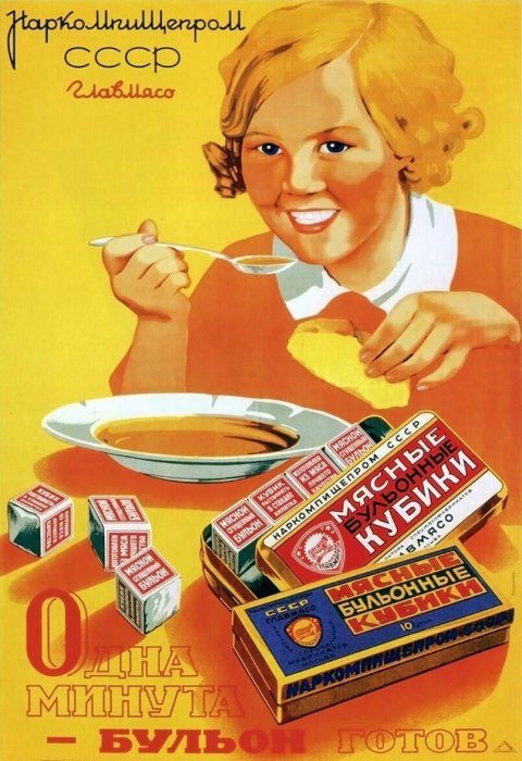 Довольно популярным продуктом в советское время были бульонные кубики. Причем, по сравнению с современными аналогами, они, во-первых, действительно производились кубической формы, а во-вторых, изготавливались из натуральных продуктов высшего качества. Так, в их составе можно было найти мясо, экстракты овощей, жир, соли, сахара, различные приправы и крахмала. Кроме того, любили их покупать еще и благодаря упаковке из добротной жести, которую ни в коем случае не выбрасывали, а использовали в хозяйстве, например, для хранения мелких вещей.
