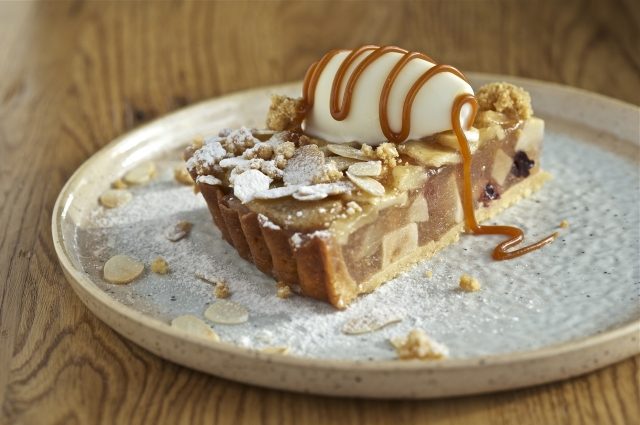 Шаг 6. Готовый горячий пирог смазать холодным грушевым гелем и сверху выложить шарик мороженого.