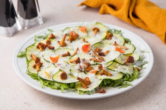 Шаг 4. Сверху кладем цукини, на них — жареные лисички и ломтики сыра пекорино.