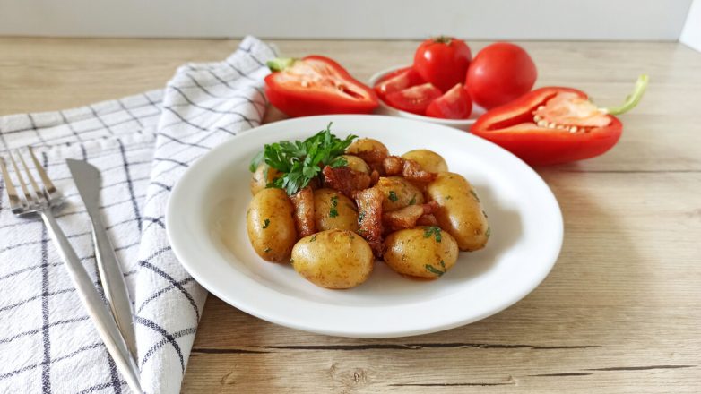 5. Молодой картофель с салом подаем к столу в горячем виде как самостоятельное блюдо. Дополняем прием пищи салатом из сезонных овощей. Приятного аппетита!