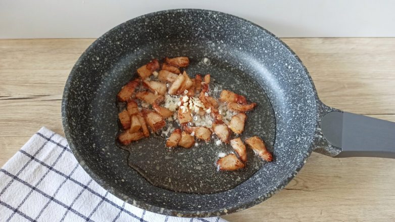 3. Зубчик чеснока очищаем от шелухи, пропускаем через пресс или мелко нарезаем ножом. Добавляем его в сковороду с салом и в течение одной минуты обжариваем на умеренном огне.