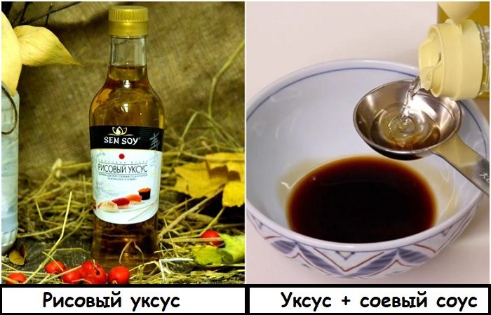 Несмотря на то, что рисовый уксус не входит в категорию люксовых продуктов и его стоимость не является очень большой, продукт не всегда можно найти на полках магазинов. В этом случае предлагаем приготовить достойную альтернативу. Для этого возьмите небольшое количество обычного уксуса, добавьте в него соевый соус и сахар. Вуаля – аналог рисового уксуса, подходящий для большинства рецептов, готов.