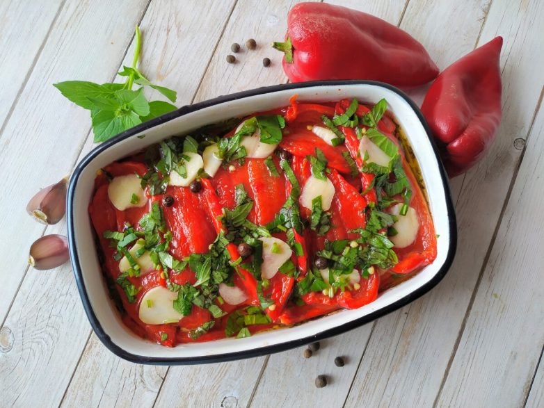 Лучше использовать красный перец, тогда закуска получится яркой, как у меня. Это перец быстрого приготовления, готов к употреблению он уже через 6 часов, но даже если приготовите его за пару часов до подачи, не прогадаете.