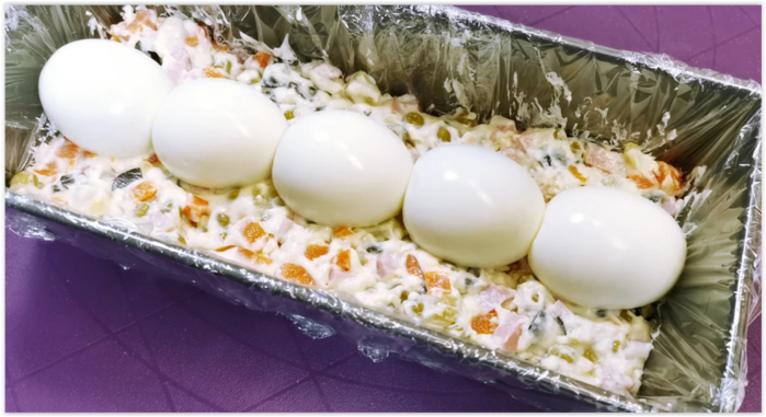 А сейчас очередь дошла и до вареных яиц. Целые яйца нужно уложить поверх слоя салата. Укладывать их нужно довольно плотно друг к другу.