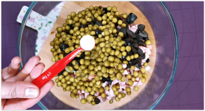 Складываем все нарезанные ингредиенты в большую миску, добавляем к ним зеленый горошек и солим по вкусу. А вот жидкость из банки с горошком выливать не нужно, она нам очень пригодится дальше.