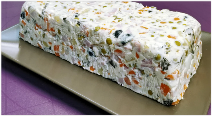 Вот так выглядит застывший салат. Уже очень необычно. Не правда ли?