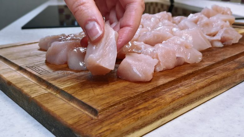 В рецепте используется филе куриной грудки. Филе лучше всего нарезать небольшими кусочками, как на плов, но не мельчить слишком сильно.