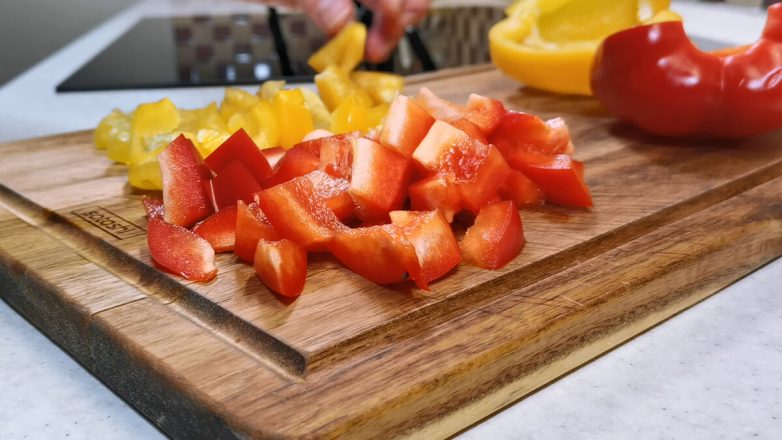 И нарезать болгарский перец на кусочки среднего размера. Перец придаст блюду сочность и потрясающий аромат. И вот как раз перца должно быть достаточно много. Если есть возможность использовать перец разного цвета, то получится еще и очень красиво.