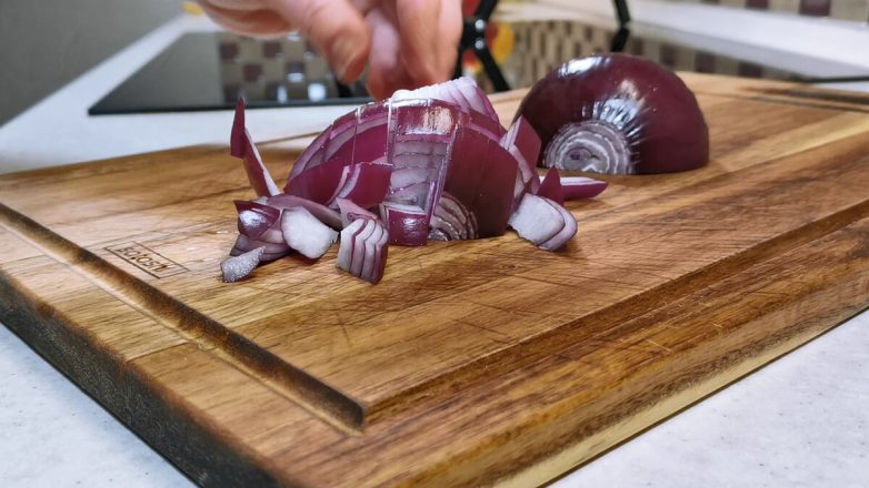 Репчатый лук нарезать средним кубиком. Лука не обязательно должно быть много. Достаточно одной крупной луковицы.