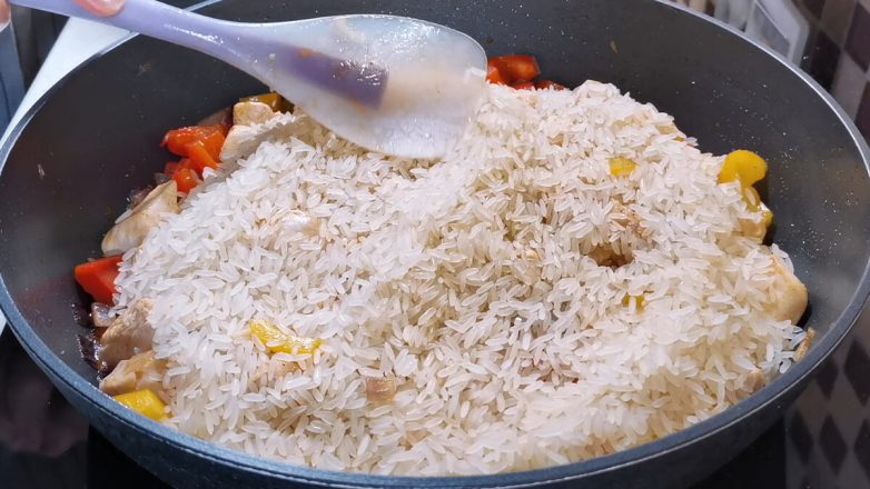 Затем высыпать в сковороду заранее промытый рис. В данном рецепте используется пропаренный рис. Он подходит больше всего.
