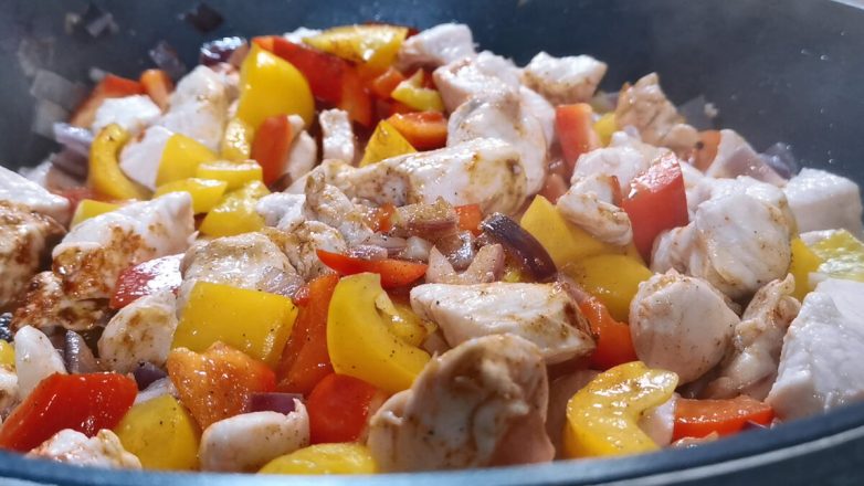 После этого выложить болгарский перец, посолить, поперчить по вкусу и добавить специи. В рецепте используются карри и сладкая паприка. Перемешать и держать на том же огне около 2 минут помешивая.
