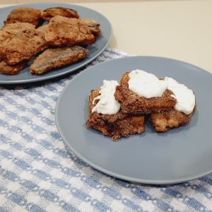 Далее делаю панировку из 2 ст.л. манки и 2 ст.л. панировочных сухарей и обваливаю каждый кусочек в панировке и обжариваю на растительном масле.