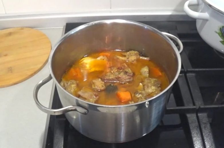 В конце добавляем в кастрюлю бульон, накрываем всё крышкой и доводим до кипения на большом огне. После чего убавляем огонь до минимального и оставляем ребрышки тушиться в течение 2–2,5 часов.