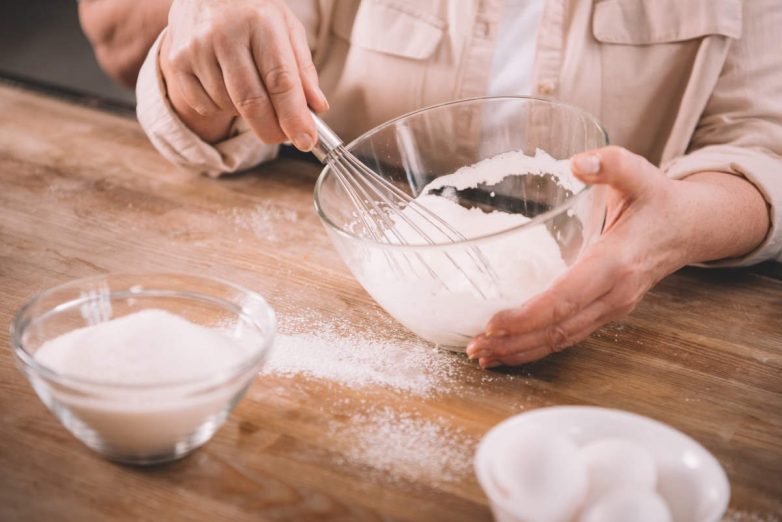 Просей муку, добавь в нее 1 ч. л. разрыхлителя, соль и сахар.Смешай сухие ингредиенты с кефиром венчиком до однородности. Старайся хорошенько вымешать тесто, чтобы не оставлять комочков. Тесто должно получиться густое, как сметана.