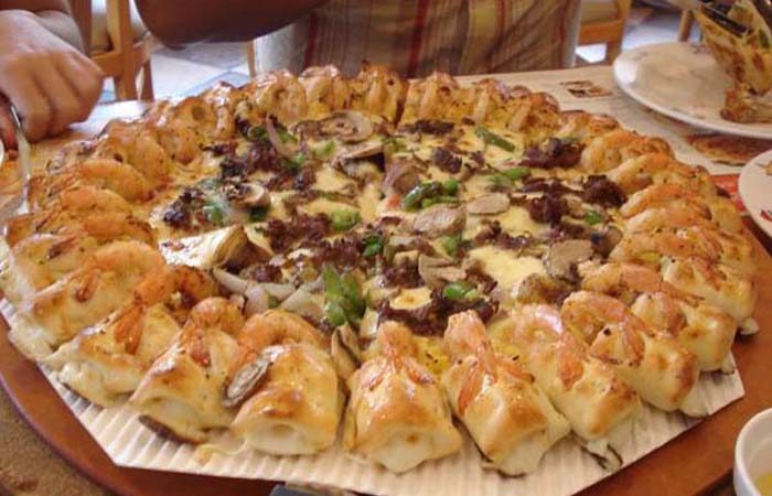 Компания Pizza Hut снова собирается удивить новым рецептом! В этот раз это кулинарный шедевр под названием «Сырная пицца с целыми креветками»! Возможно, ингредиенты, входящие в состав пиццы никого не удивят, но презентация просто превосходна. В основе пиццы – рулет, начиненный креветками, моцареллой и запеченный до золотистого цвета. Пицца разделена на 32 сектора. 2. Пицца с хрустящими цикадами – США