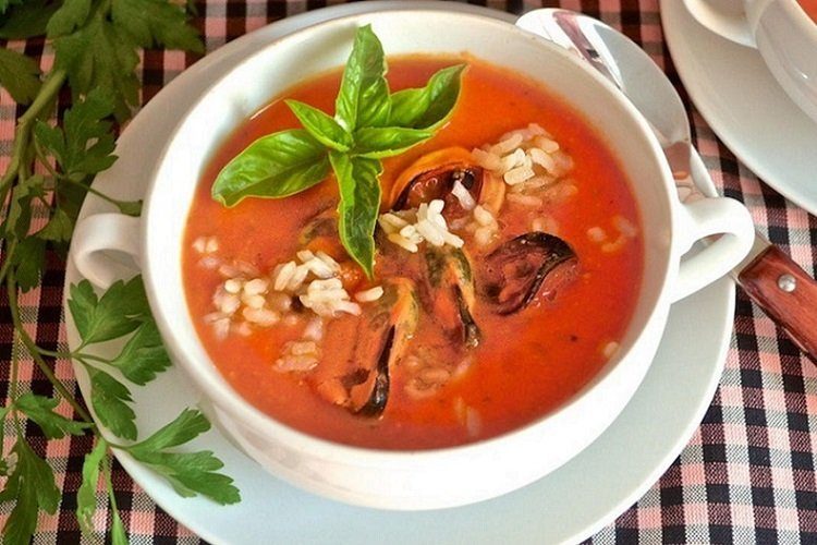 Ароматный рисовый суп с морепродуктами и чесноком.