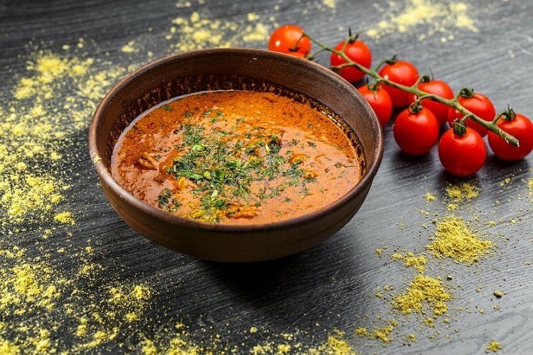 Приготовление: Нарежь мясо и овощи. Провари говядину со специями 40 минут. Всыпь картофель, острый перец и рис. Обжарь лук с морковью, добавь томатную пасту, орехи, 100 мл бульона и протуши 5 минут. Влей зажарку в суп, через 10 минут посоли и присыпь нарубленной зеленью.
