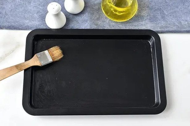 3. Сделать тесто более хрустящим поможет оливковое масло, которым стоит смазать противень. Сверху на него выложите тесто и отправьте на 5 минут в духовку, предварительно разогретую до 220 градусов. Добавлять начинку нужно по истечении этого времени.