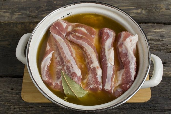 В отличие от классического способа маринования мяса, этот предполагает использование рассола. Делается он очень просто – из соли и воды. Ингредиенты берутся в следующем соотношении: ¼ стакана соли на литр воды. Также в рассол нужно добавить травы и специи по своему усмотрению.