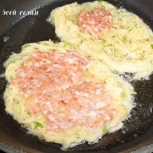 И закрываю фарш овощной смесью и придаю ровную форму колдуну-дранику.