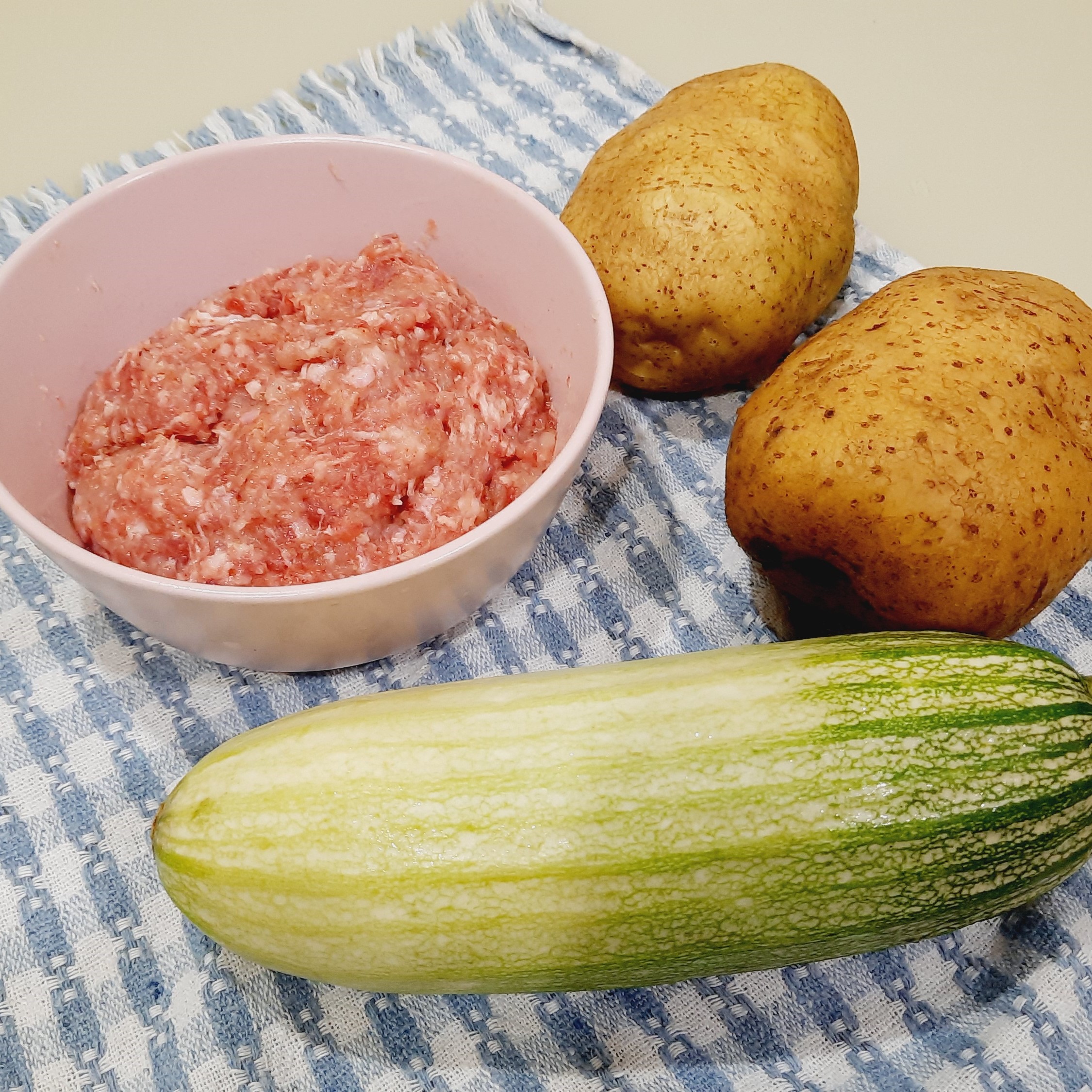 Если есть немного фарша, беру картофель, небольшой кабачок и готовлю сытное блюдо