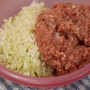 Капусту трем на крупной терке и соединяем с фаршем. Фарш у меня уже готовый, в нем есть яйцо, специи, соль., поэтому просто хорошо все вымешиваю, до получения однородной и плотной массы.