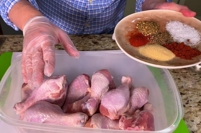 Первым делом наливаем на противень растительное масло и отправляем его в духовку, установив температуру в 200 градусов.А тем временем, пока масло разогревается, нанесем на куриные ножки подготовленные специи. К слову, семена кориандра и зиры предварительно следует перемолоть в кофемолке. Сделать это нужно, чтобы пряности имели более насыщенный аромат и лучше пропитали мясо.